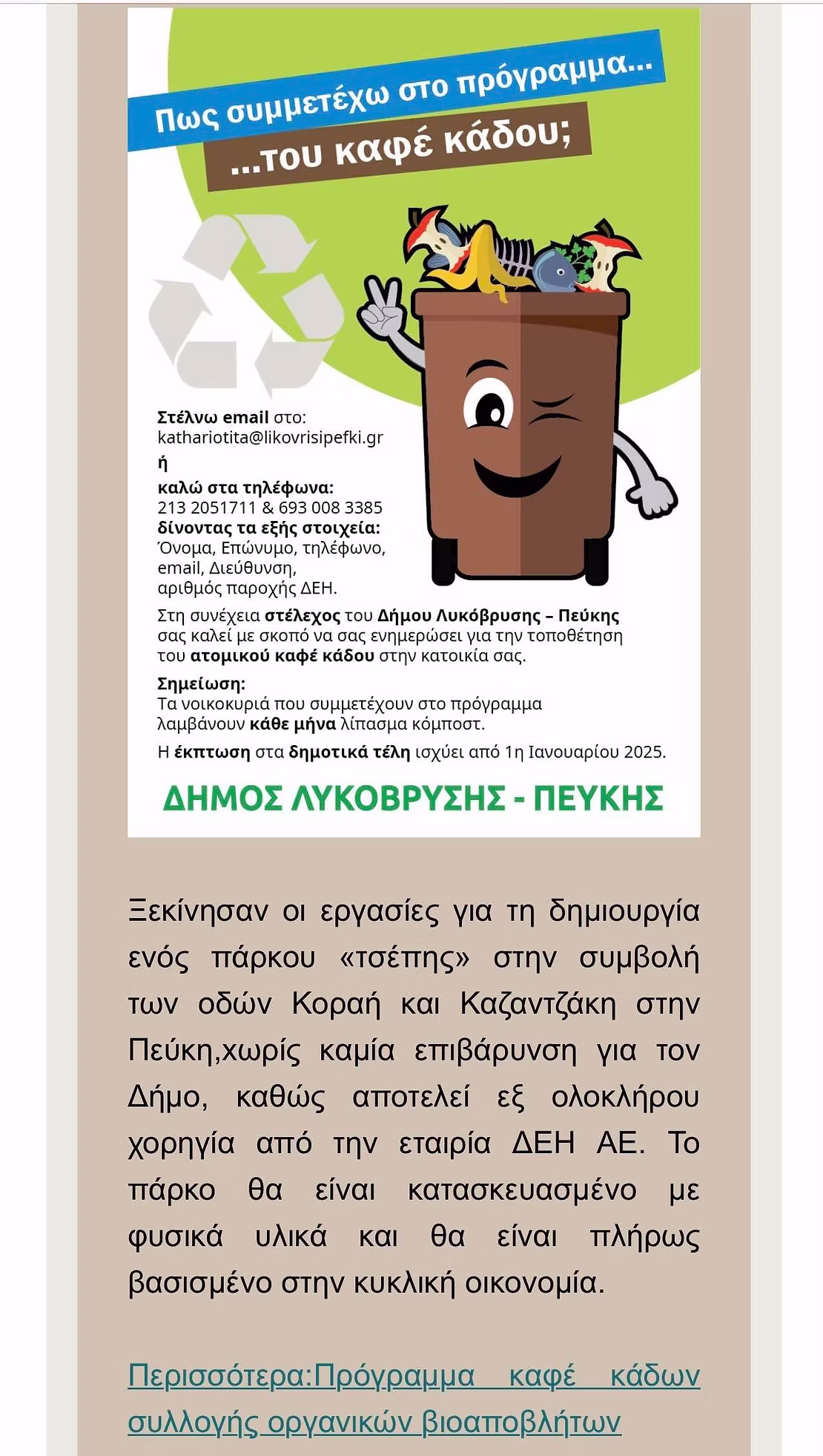 Εικόνα 4: Το e-mail του Δήμου Λυκόβρυσης-Πεύκης για την έναρξη των εργασιών δημιουργίας του «πάρκου τσέπης».